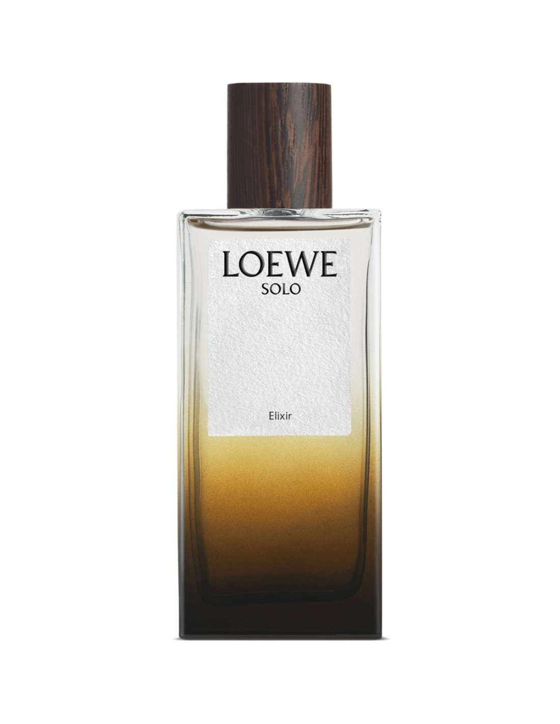 LOEWE Solo Elixir EDP aparece encapsulado en un frasco de vidrio translúcido con un degradado en tono tierra, haciéndose eco del frasco de la fragancia original, culminado por un tapón de madera wengué.